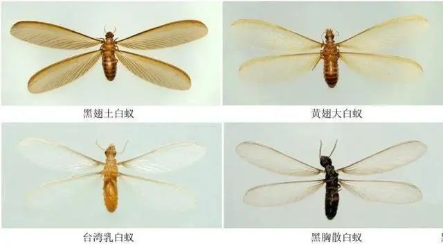 (3) 黄翅大白蚁:①有翅成蚁:头、胸和腹背面红褐色,前胸背板中央有一淡色的"+"形纹;翅黄色,足棕黄色。②兵蚁:大兵蚁头部特别大,最宽处位在头壳的中后部,深黄色;上颚粗壮、镰刀状,黑色,右上颚无齿。小兵蚁体形比大兵蚁小得多,体色较淡;头卵形,后侧角圆形。③工蚁:大工蚁头圆形,棕黄色;胸腹浅棕黄色,前胸背板宽约为头宽的一半,前缘翘起;腹部膨大如橄榄形。小工蚁体色比大工蚁浅,其余与大工蚁略同。④蚁后:头、胸部黑褐色,无翅,腹部椭圆形,红褐色。